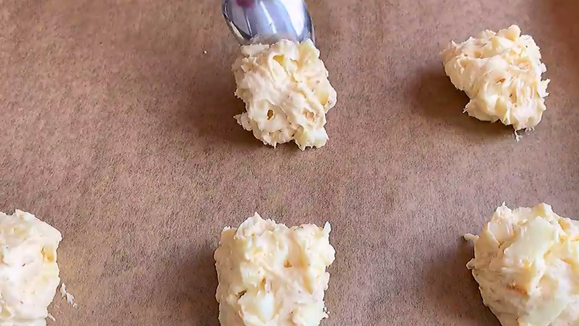 5. Печенья формируем с помощью двух столовых ложек. Выкладываем его на противень застеленный пергаментной бумагой. Сверху присыпаем лепестками миндаля.