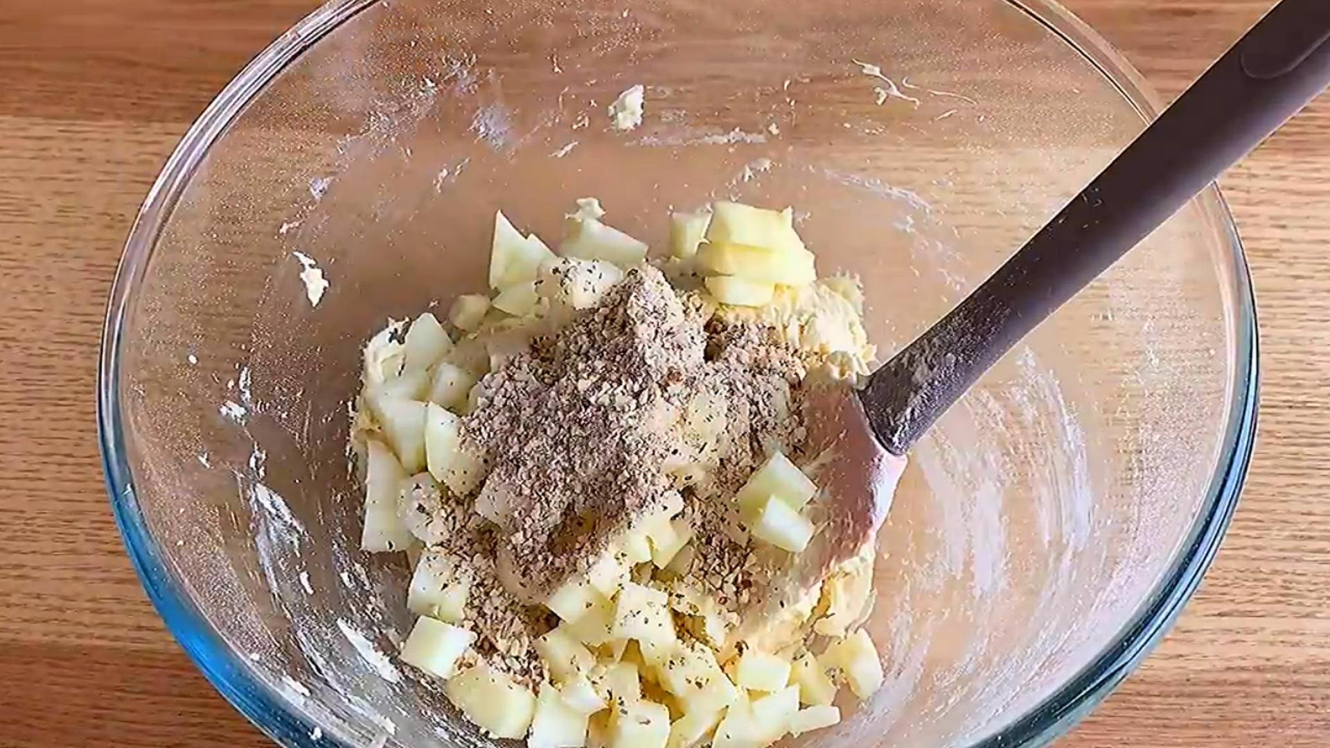 4. Яблоко очищаем и нарезаем на мелкие кубики. Добавляем их к тесту. И так же всыпаем измельченный миндаль. Перемешиваем продукты лопаткой.