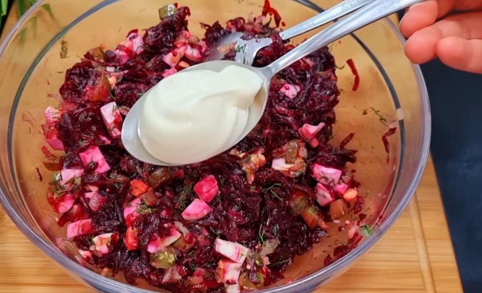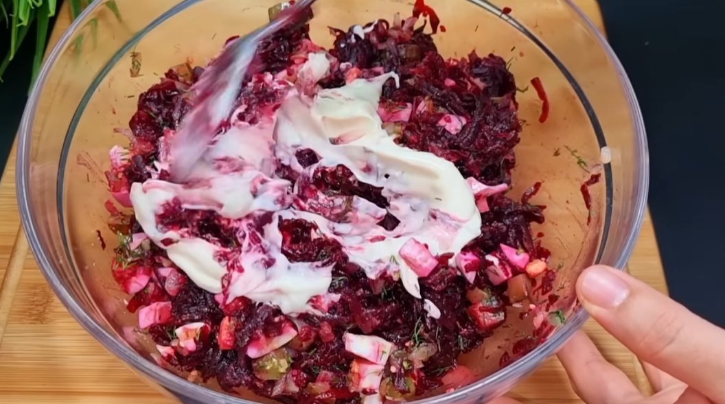 5. И на финальном этапе кладём 2-3 ст. л. майонеза. Да, это винегрет с майонезом. Рецепт неклассический.