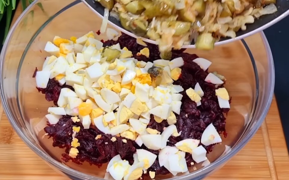 3. Варёную или запечённую свеклу натираем на крупной тёрке. Яйца следует порезать кубиками .