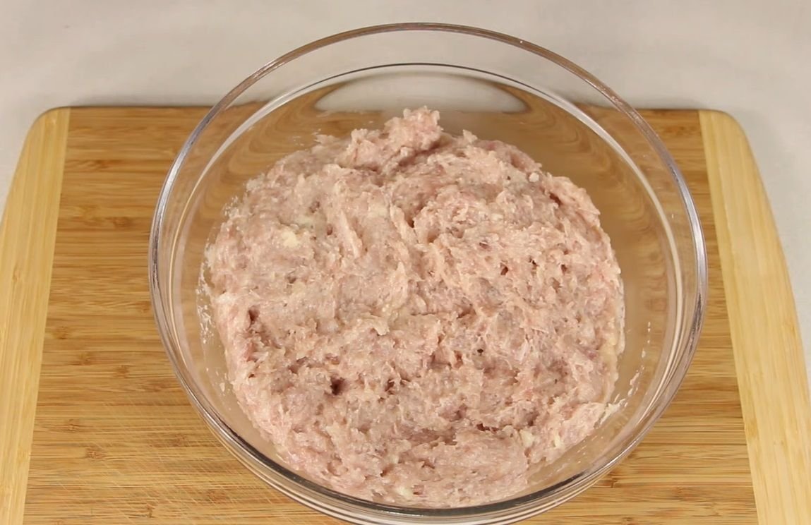 Из курицы нужно сделать фарш, для этого необходимо пропустить мясо два раза через мясорубку. После, нужно к фаршу добавить хлебную массу, все тщательно перемешать, посолить. Добавить сливочное масло, и еще раз перемешать. Полученную массу отправить в холодильник на 20 минут.