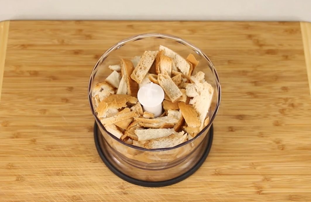 Пока фарш для куриных котлет стоит в холодильнике, нужно приготовить панировку. Для этого корочки от хлеба нужно положить в блендер и измельчить. Измельченные корочки нужно смешать с панировочными сухарями.