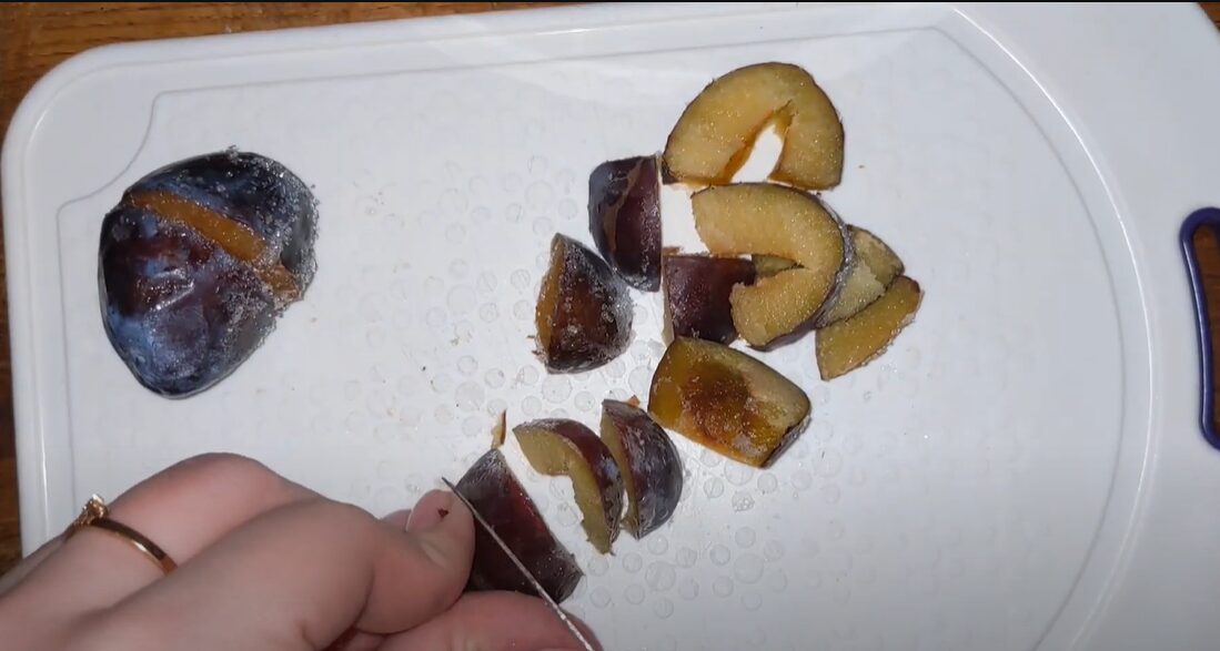 Для начала подготовим сливы. Можно использовать свежие фрукты или замороженные. Сливы моем, просушиваем, чистим от камешка и нарезаем на небольшие кусочки.