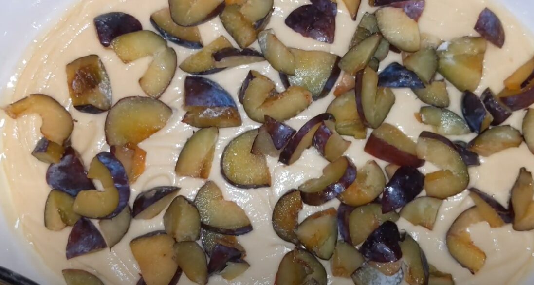 Берем форму для выпечки, смазываем ее тонким слоем растительного масла. Выливаем все тесто и разравниваем по форме. Наверх выкладываем нарезанную сливу.